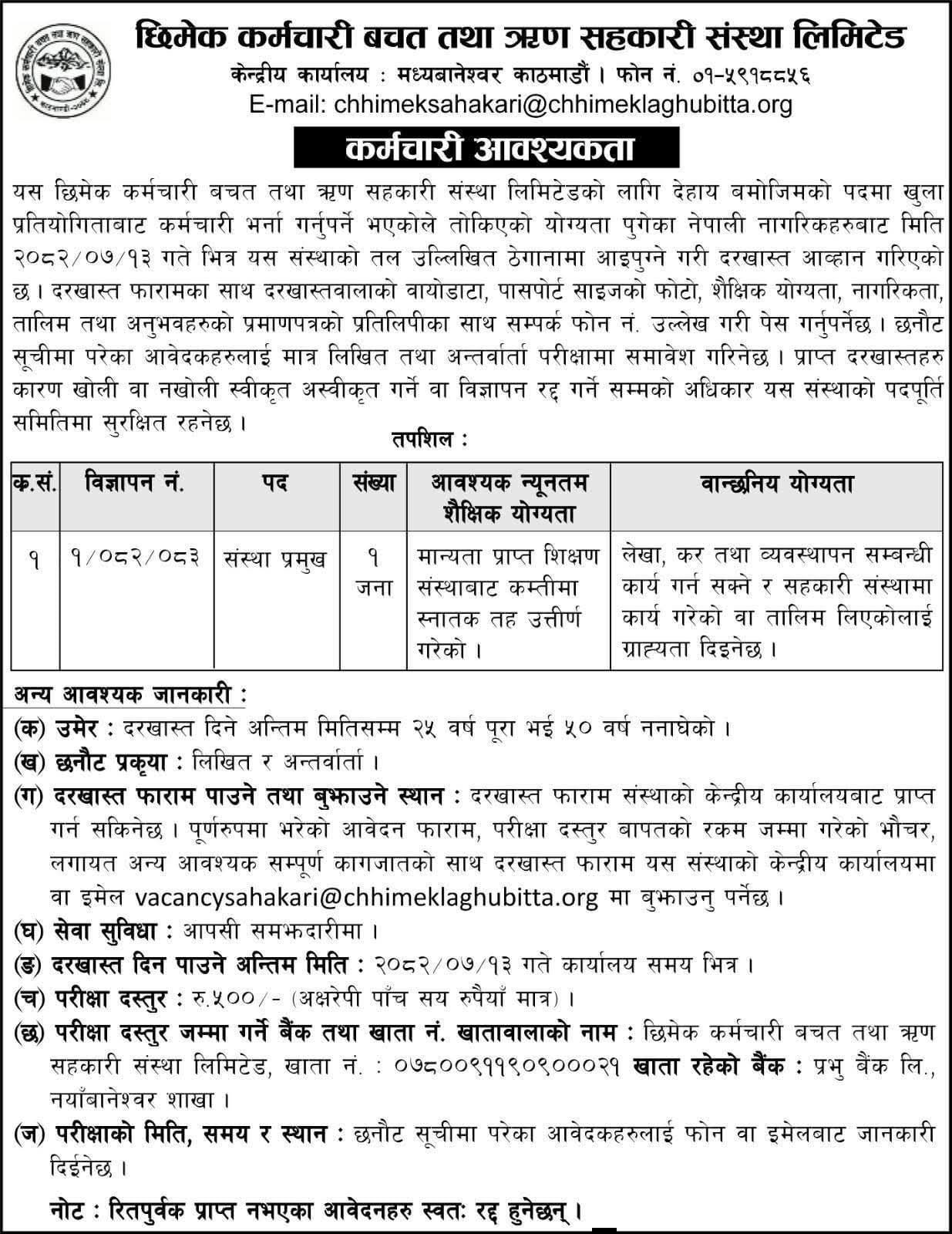 छिमेक लघुवित्तले माग्यो संस्था प्रमुख, कति चाहिन्छ योग्यता?