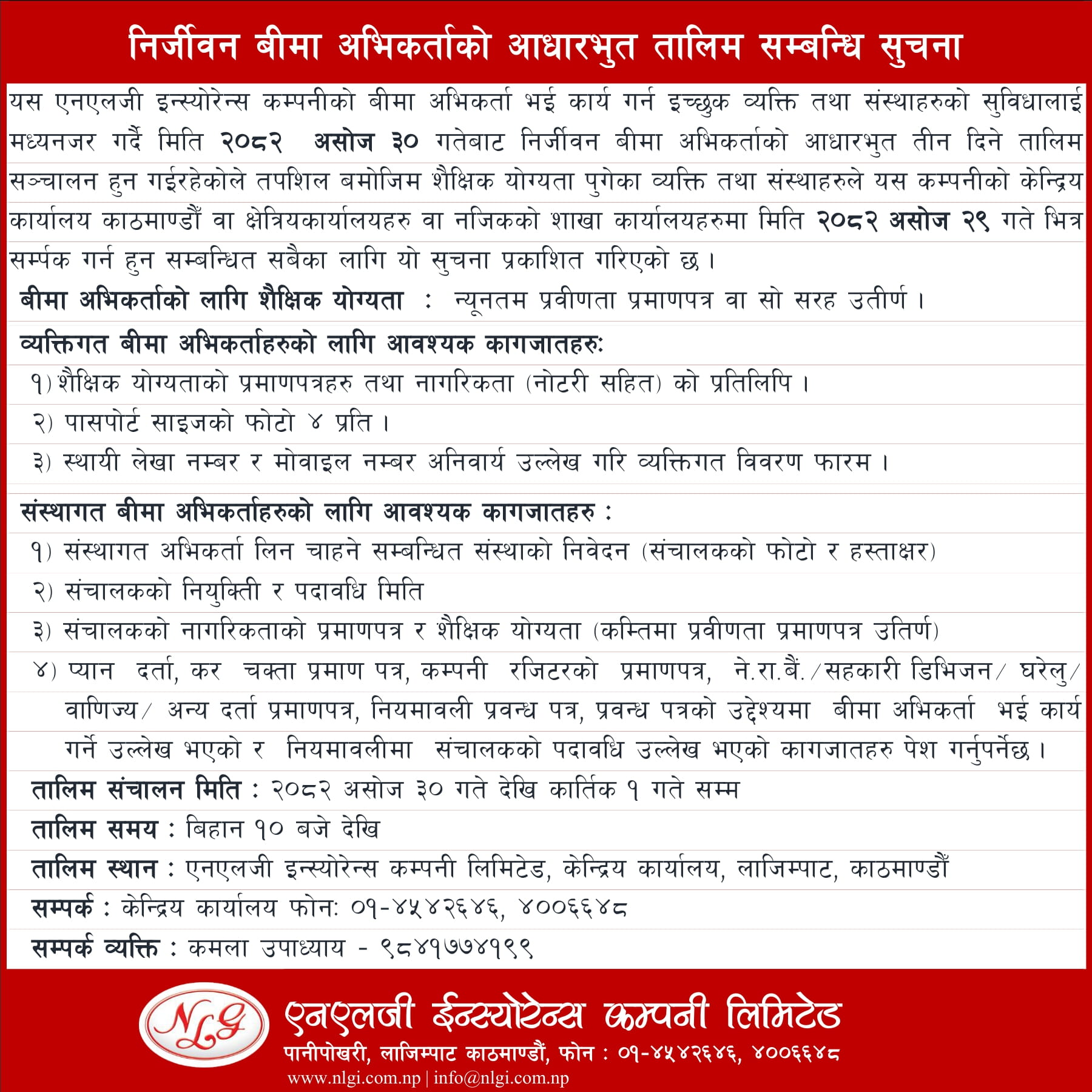 एनएलजी इन्स्योरेन्सले अभिकर्ता तालिम सञ्चालन गर्ने, सहभागी बन्न यसरी दिनुहोस् आवेदन