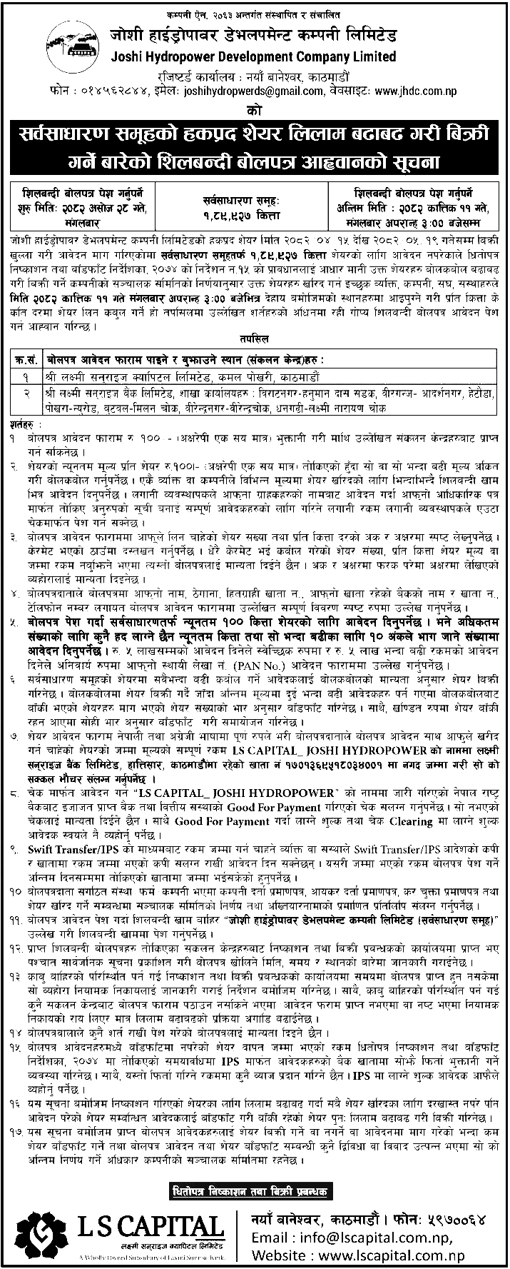 बोलपत्र असोज २८ गते मंगलबारदेखि कात्तिक ११ गते मंगलबार दिउँसो ३ बजेभित्र पेश गरिसक्नु पर्नेछ। बोलपत्र फाराम काठमाडौंको कमलपोखरीस्थित कम्पनीको बिक्री प्रबन्धक लक्ष्मी सनराइज क्यापिटल लिमिटेडको पाइनेछ।