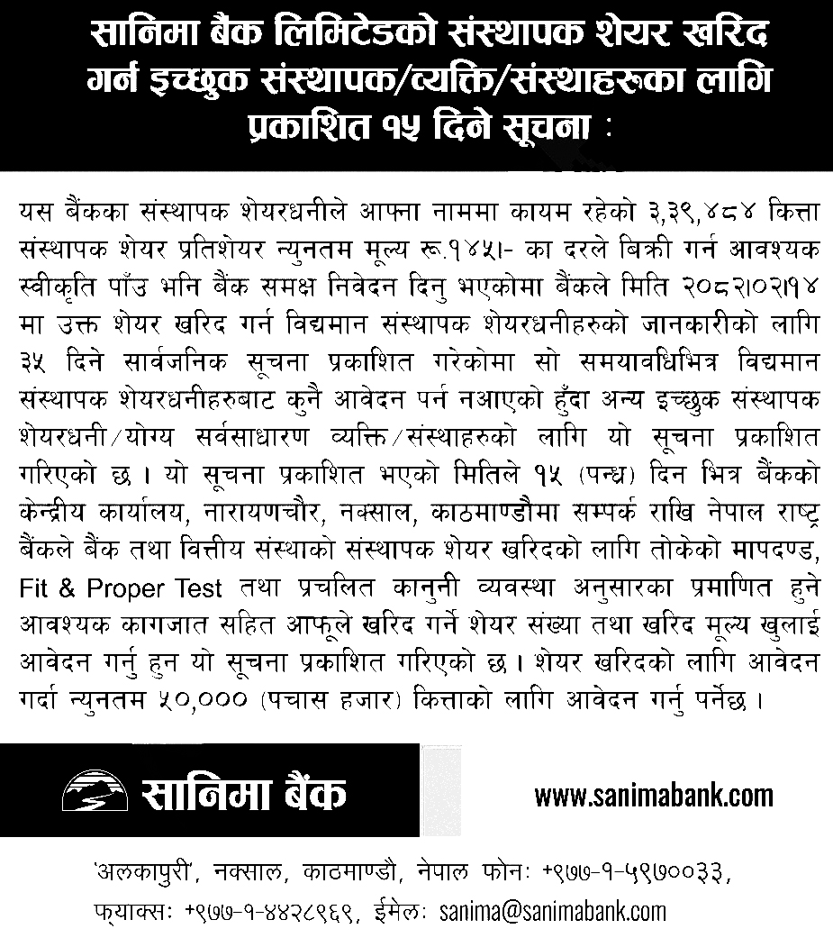 काठमाडौं । सानिमा बैंक लिमिटेडले आफ्ना संस्थापक शेयरधनीहरूको नाममा रहेको ३ लाख ३९ हजार ४८४ कित्ता संस्थापक शेयर बिक्रीमा राखेको छ।