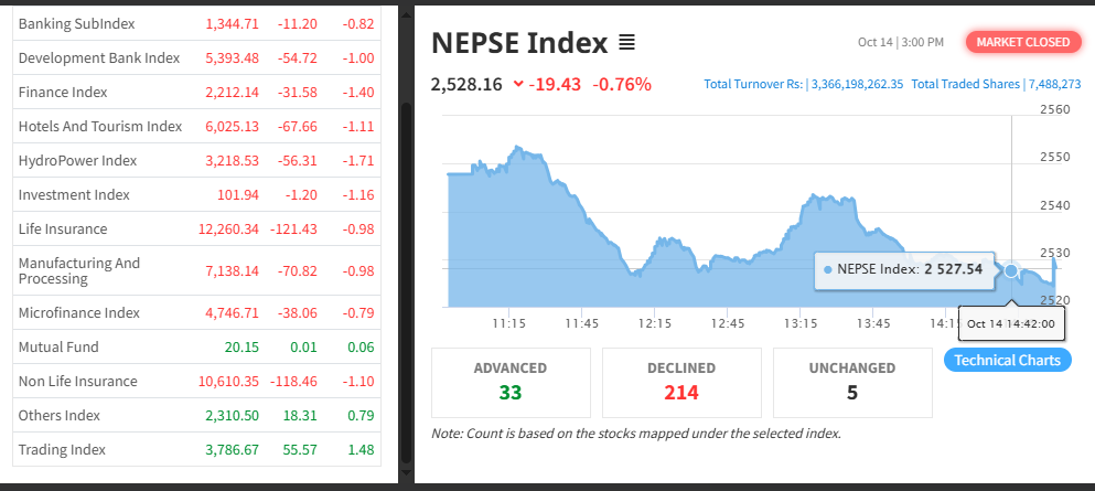 नेपाल स्टक एक्सचेञ्ज (नेप्से) १९.४३ अकंले घटेर २५२८.१६ बिन्दुमा कायम भएको छ । आज ३१७ कम्पनीको ७४ लाख ८८ हजार कित्ता शेयर किनबेच हुँदा ३ अर्ब ३६ करोड ६१ लाख रुपैयाँको कारोबार भएको हो ।