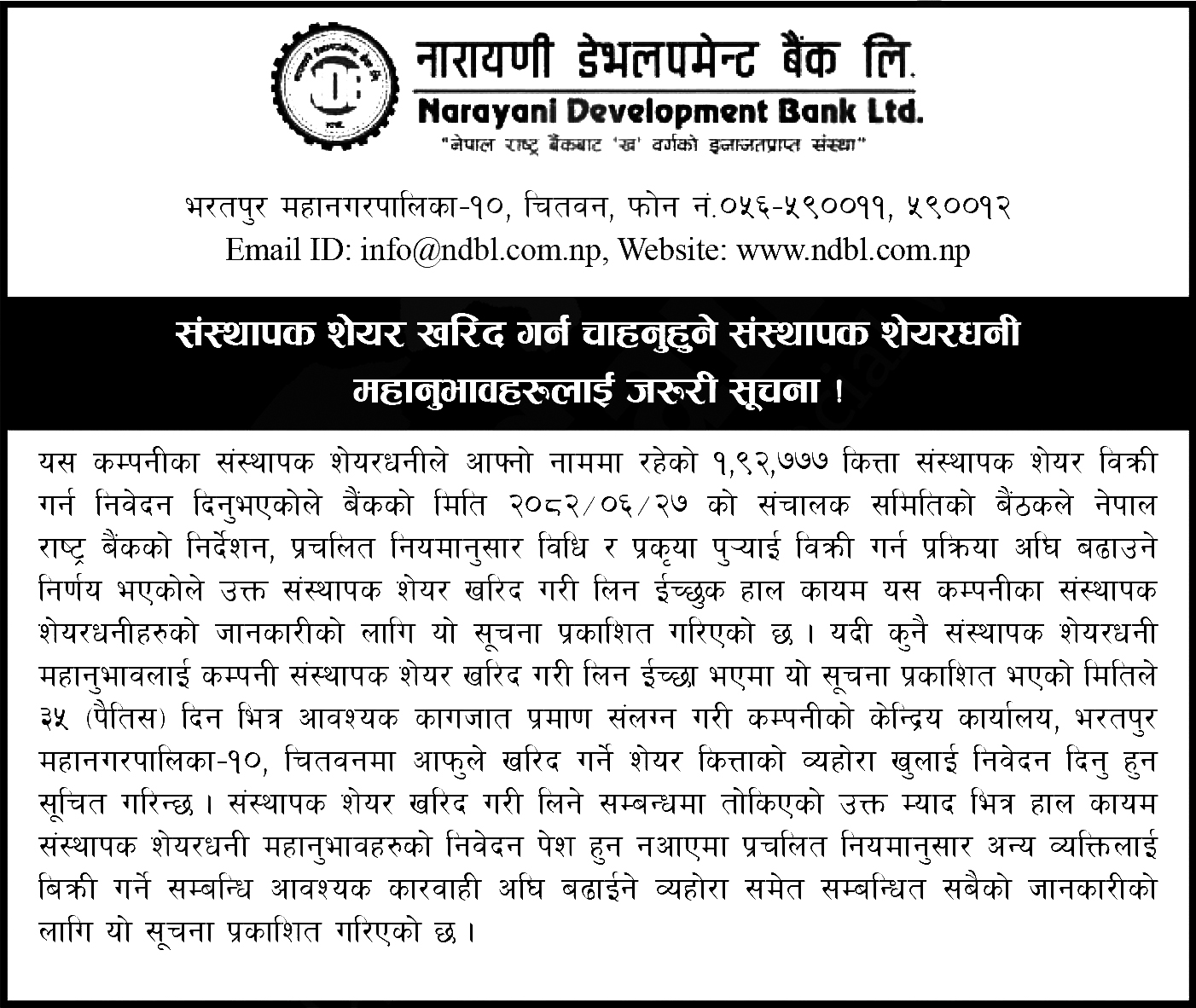 काठमाडौं । नारायणी डेभलपमेन्ट बैंक लिमिटेडले आफ्ना संस्थापक शेयरधनीको नाममा रहेको १ लाख ९२ हजार ७७७ कित्ता संस्थापक शेयर बिक्रीमा राखेको छ।