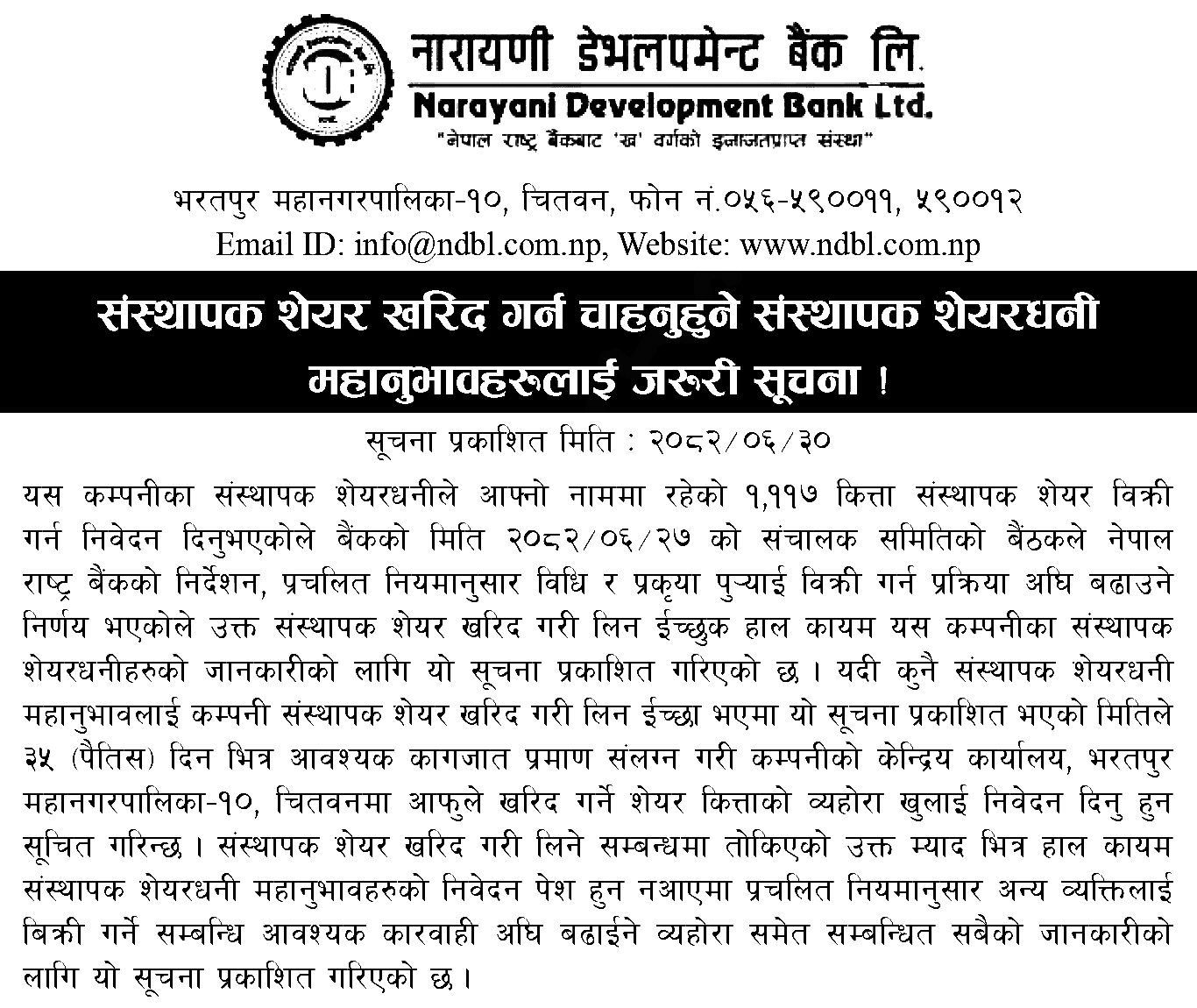 काठमाडौं । नारायणी डेभलपमेन्ट बैंक लिमिटेडले संस्थापक शेयरधनीको नाममा रहेको १ हजार ११७ कित्ता संस्थापक शेयर बिक्रीमा राखेको छ।