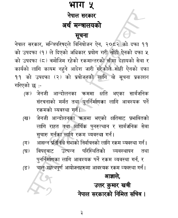 अर्थ मन्त्रालयका निमित्त सचिव उत्तरकुमार खत्रीले बिहीबार नेपाल राजपत्रमा प्रकाशन गरेको सूचना अनुसार विनियोजन ऐन २०८२ को दफा ५ को उपदफा ८ ले तोकेको सीमा हटाउने निर्णय भएको उल्लेख गरिएको छ ।