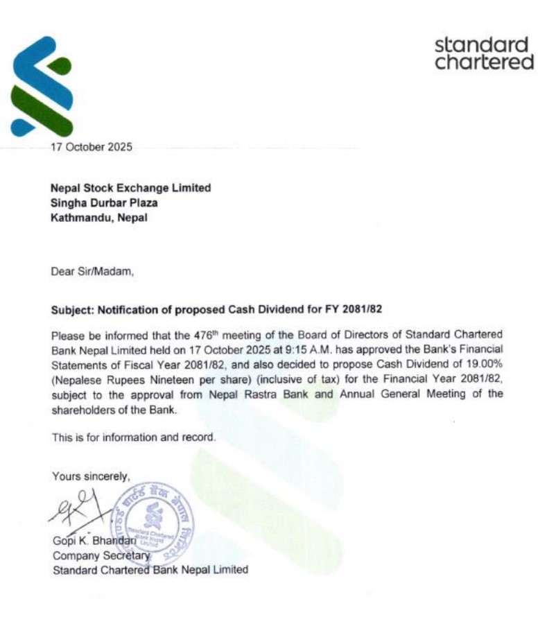 काठमाडौं । स्ट्याण्डर्ड चार्टर्ड बैंक लिमिटेडले आफ्ना शेयरधनीहरूलाई १९ प्रतिशत नगद लाभांश दिने घोषणा गरेको छ।