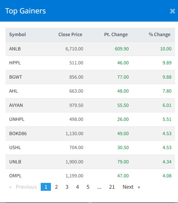 साथै, आज हिमालयन पावर पार्टनर, भगवति हाइड्रोपावर, एशियन हाइड्रोपावर, अभियान लघुवित्त, युनियन हाइड्रोपावर लगायतका कम्पनीहरुको शेयरमूल्य बृद्धि भएको छ ।