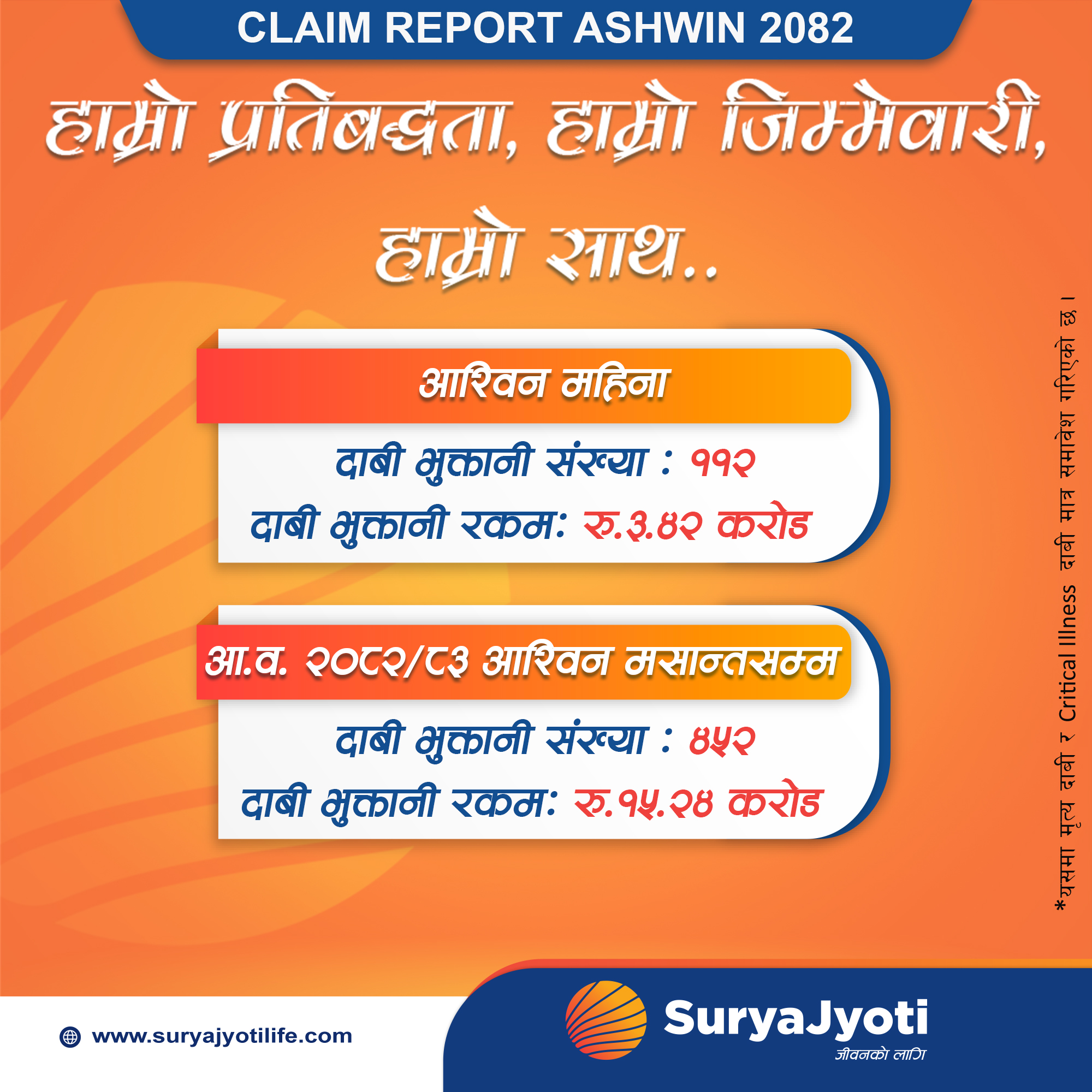 सूर्यज्योति लाइफ इन्स्योरेन्सले चालु आर्थिक वर्षको असोज मसान्तसम्मको अवधिमा कुल १५ करोड २४ लाख रुपैयाँको बीमा दावी भुक्तानी गरको छ । यस अवधिमा कम्पनीले कुल ४५२ वटा बीमा दावी फछ्र्र्याैट गरेको छ ।