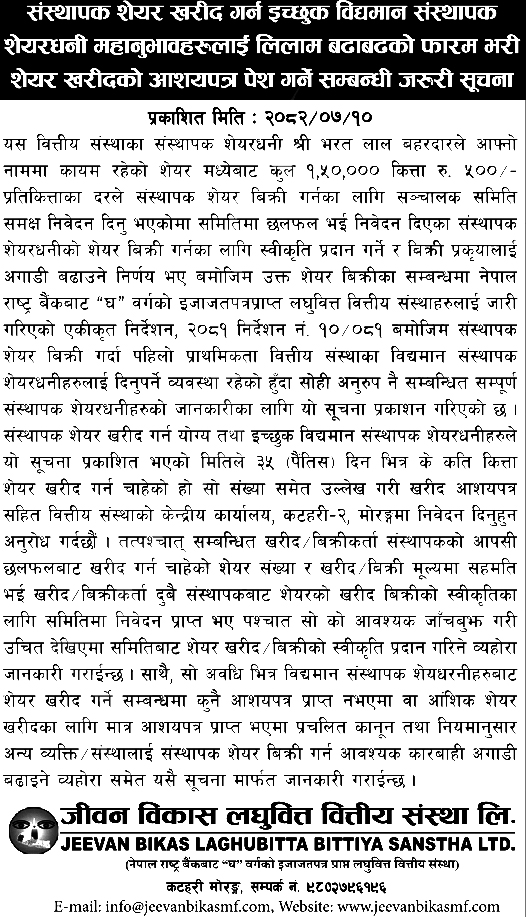 काठमाडौं । जीवन विकास लघुवित्त वित्तीय संस्था लिमिटेडले संस्थापक शेयरधनी भरत लाल बहरदारको नाममा रहेको १ लाख ५० हजार कित्ता संस्थापक शेयर बिक्रीमा राखेको छ।