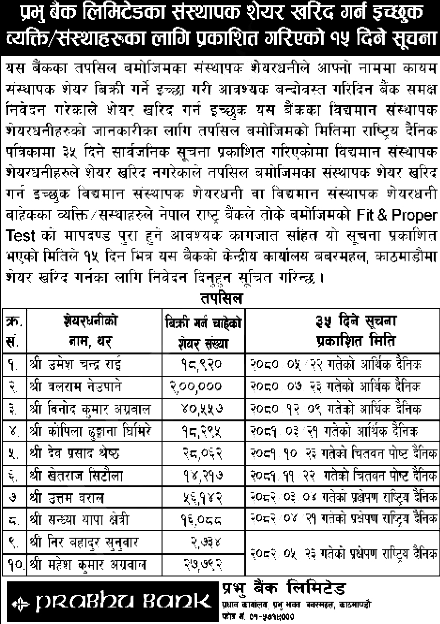 काठमाडौं । प्रभु बैंक लिमिटेडले विभिन्न १० जना संस्थापक शेरधनीहरूको नाममा रहेको कुल ४ लाख २२ हजार ८०७ कित्ता संस्थापक शेयर बिक्रीमा राखेको छ।