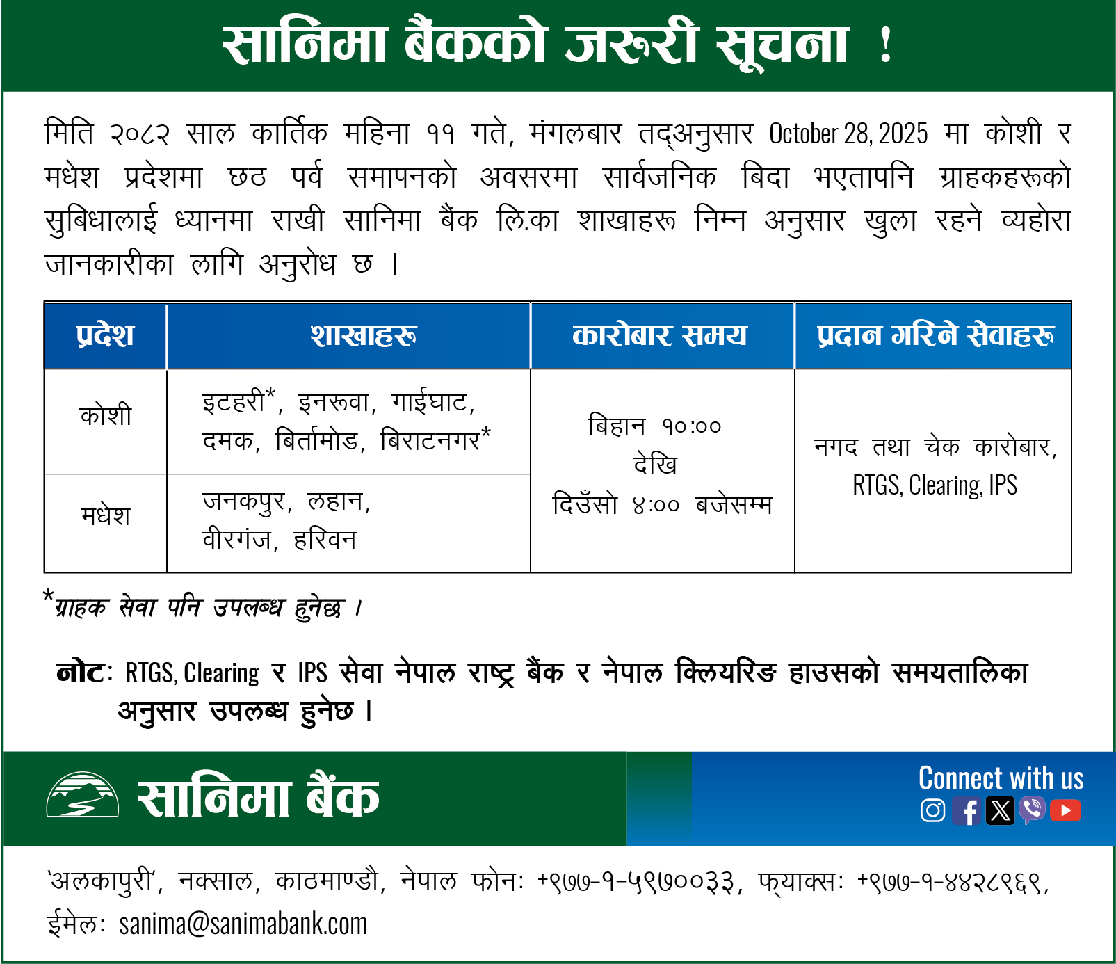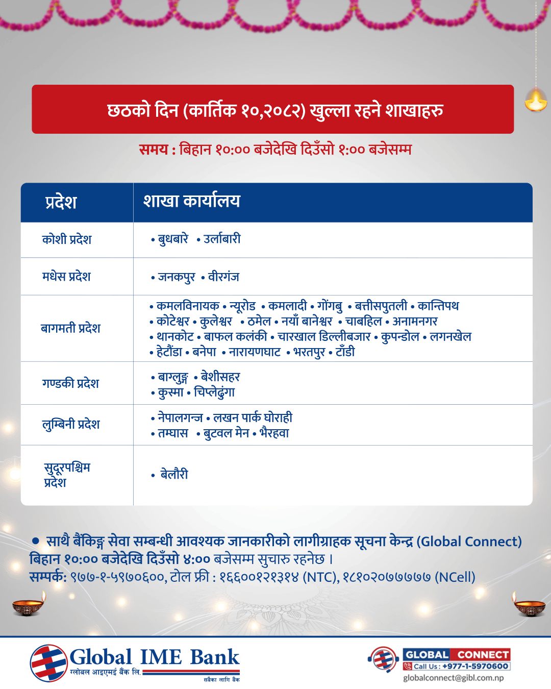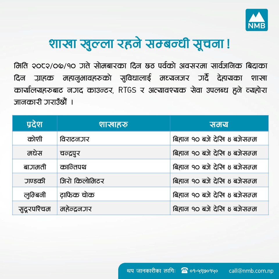 काठमाडौँ । सूर्य भगवानको आराधना र आस्थाको पर्व छठको अवसरमा आज देशभर सार्वजनिक बिदा दिइएको भए पनि अधिकांश बैंकहरुले आफ्ना शाखामार्फत सेवा सञ्चालन गर्ने भएका छन्। वाणिज्य बैंक तथा विकास बैंकहरूले ग्राहक सुविधालाई मध्यनजर गर्दै केहि शाखा खुला राख्ने निर्णय गरेका हुन्।