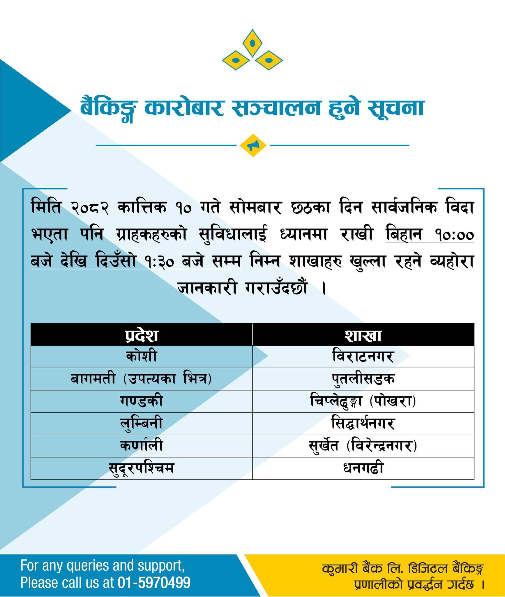 बैंकहरुले आफ्ना ग्राहकलाई नियमित सेवा प्रवाहमा अवरोध नहोस् भन्ने उद्देश्यले बिदाको दिनमा समेत शाखा सञ्चालन गर्ने भएका हुन्। केही बैंकहरुले आफ्ना शाखा तथा काउन्टर खुला रहने सूचना सामाजिक सञ्जाल र वेबसाइटमार्फत सार्वजनिक गरिसकेका छन्।