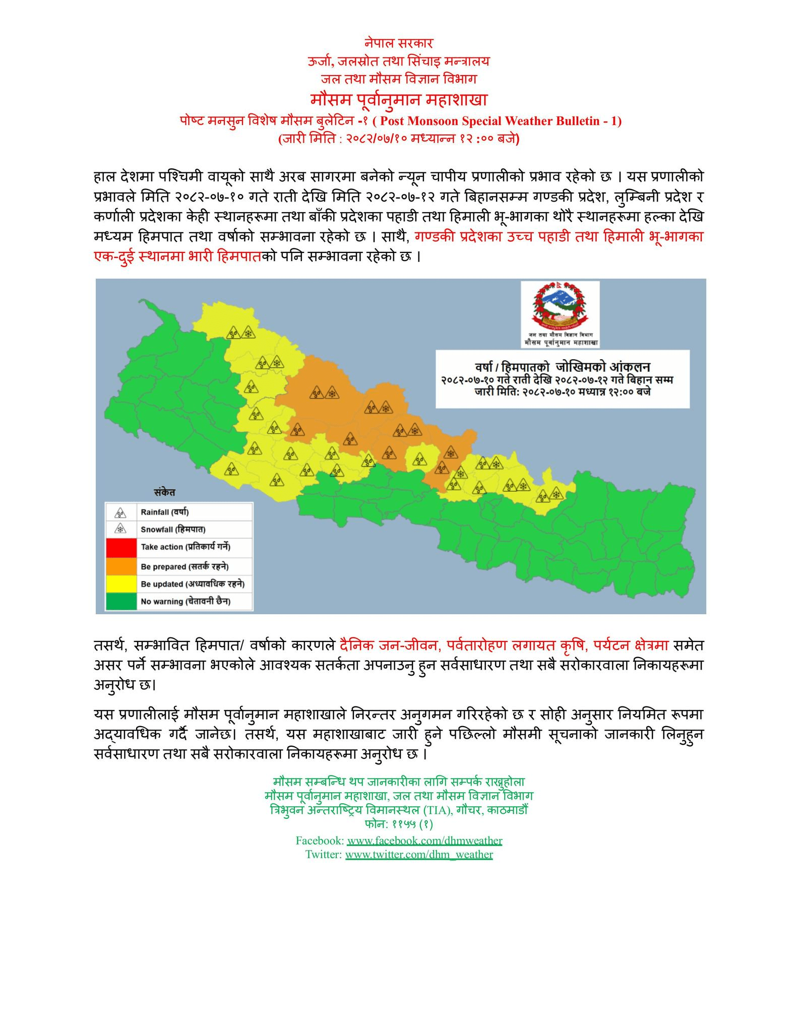 विभागले सम्भावित वर्षा र हिमपातका कारण दैनिक जनजीवन, पर्वतारोहण, कृषि र पर्यटन क्षेत्रमा असर पर्न सक्ने भन्दै सर्वसाधारण तथा सरोकारवाला निकायहरूलाई आवश्यक सतर्कता अपनाउन आग्रह गरेको छ।