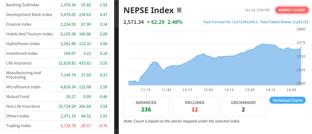 नेपाल स्टक एक्सचेञ्ज (नेप्से) ६२.२९ अकंले बढेर २५७१.३४ बिन्दुमा कायम भएको छ । आज ३१४ कम्पनीको ९२ लाख ४३ हजार ७२३ कित्ता शेयर किनबेच हुँदा ४ अर्ब ५७ करोड ३९ लाख रुपैयाँको कारोबार भएको हो ।