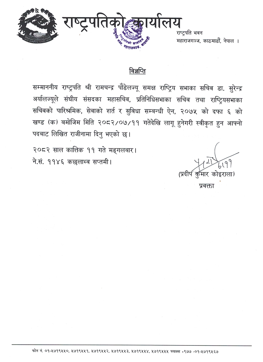 राष्ट्रियसभाका सचिव डा. सुरेन्द्र अर्यालद्वारा राजीनामा