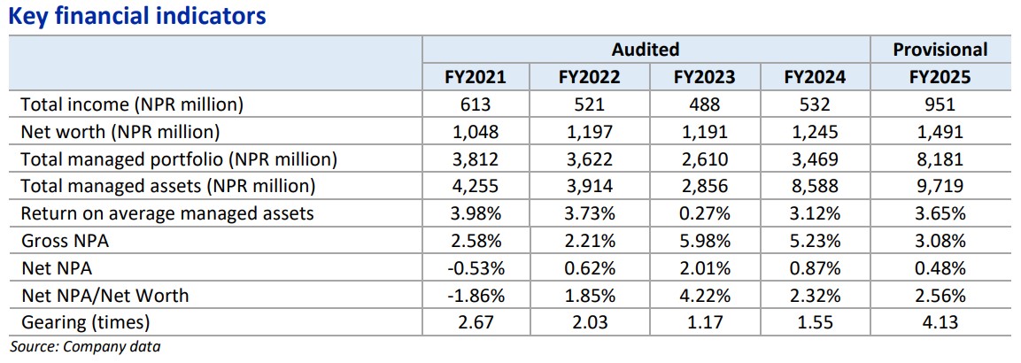 सन् २०२५ मा कम्पनीको औसत व्यवस्थापित सम्पत्तिमा प्रतिफल ३.६५ प्रतिशत पुगेको छ । सन् २०२४ मा उक्त प्रतिफल ३.१२ प्रतिशत रहेको थियो । साथै, कम्पनीको सकल गैर–सम्पादित ऋण (एनपीए) ३.०८ प्रतिशतमा सीमित रहनु, सावधानीपूर्वक जोखिम व्यवस्थापन र सन्तुलित क्रेडिट नीतिको परिणाम हो । २०२३ मा ५.९८ प्रतिशत रहेको एनपीएलाई कम्पनीले दुई वर्षमै घटाउन सफल भएको देखिन्छ ।