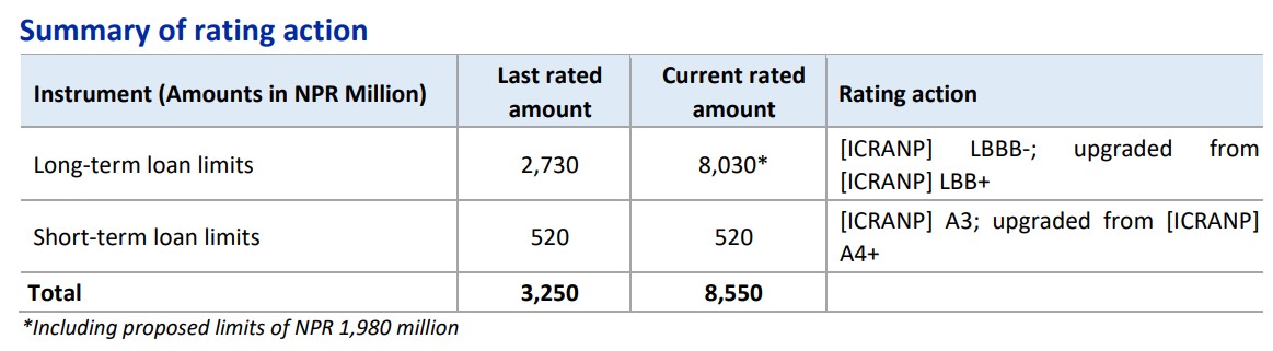इक्रा नेपालले हुलास फिनसर्भ हायर पर्चेज लिमिटेडको दीर्घकालीन ऋण मूल्यांकनलाई एल त्रिपल बि माइनस र अल्पकालीन ऋण मूल्यांकनलाई ए तीनमा उन्नति गरेको छ । कम्पनीको हालको दीर्घकालीन ऋण सीमा ८ अर्ब ३ करोड रुपैयाँ (जसमा प्रस्तावित १ अर्ब ९८ करोड रुपैयाँ समेत समावेश छ) र अल्पकालीन ऋण सीमा ५२ करोड रुपैयाँ रहेको छ । यससँगै कम्पनीको कुल मूल्यांकनयोग्य ऋण सीमा ८ अर्ब ५५ करोड रुपैयाँ पुगेको छ ।