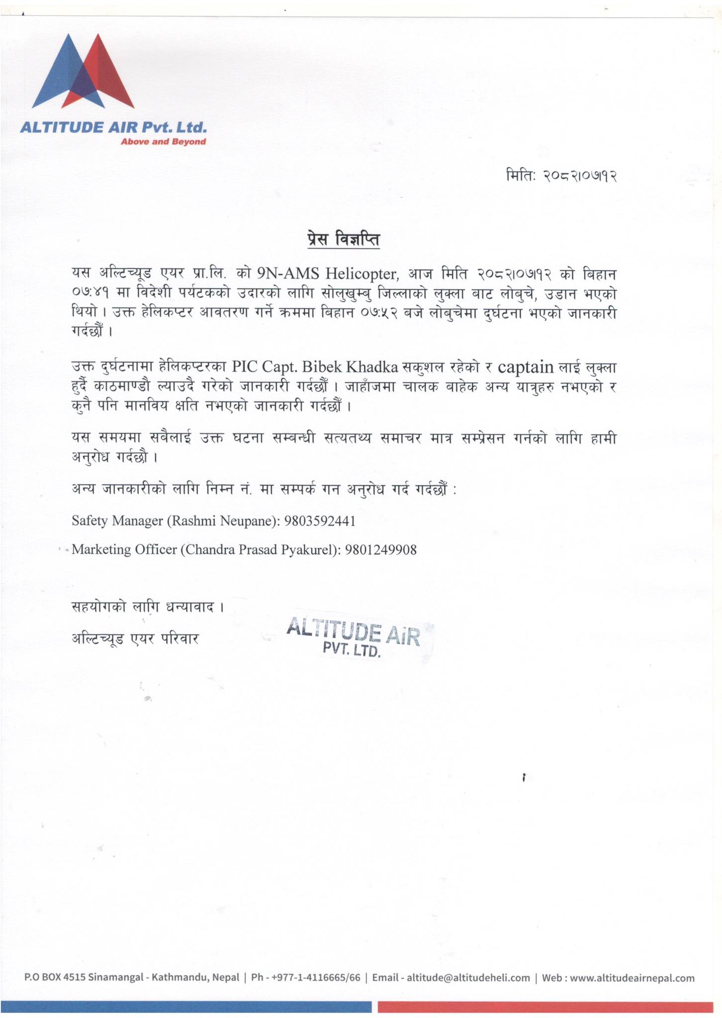 काठमाडौं । आज विहान ७ः५२ बजेको समयमा सोलुखुम्बुको लोबुचे क्षेत्रमा अल्टिच्यूट एयरको ९एन एएमएस हेलिकोप्टर दुर्घटनामा परेको छ । सो दुर्घटनाको बीमा दावी सगरमाथा लुम्बिनी इन्स्योरेन्स (सलिको)मा पर्ने देखिएको छ ।