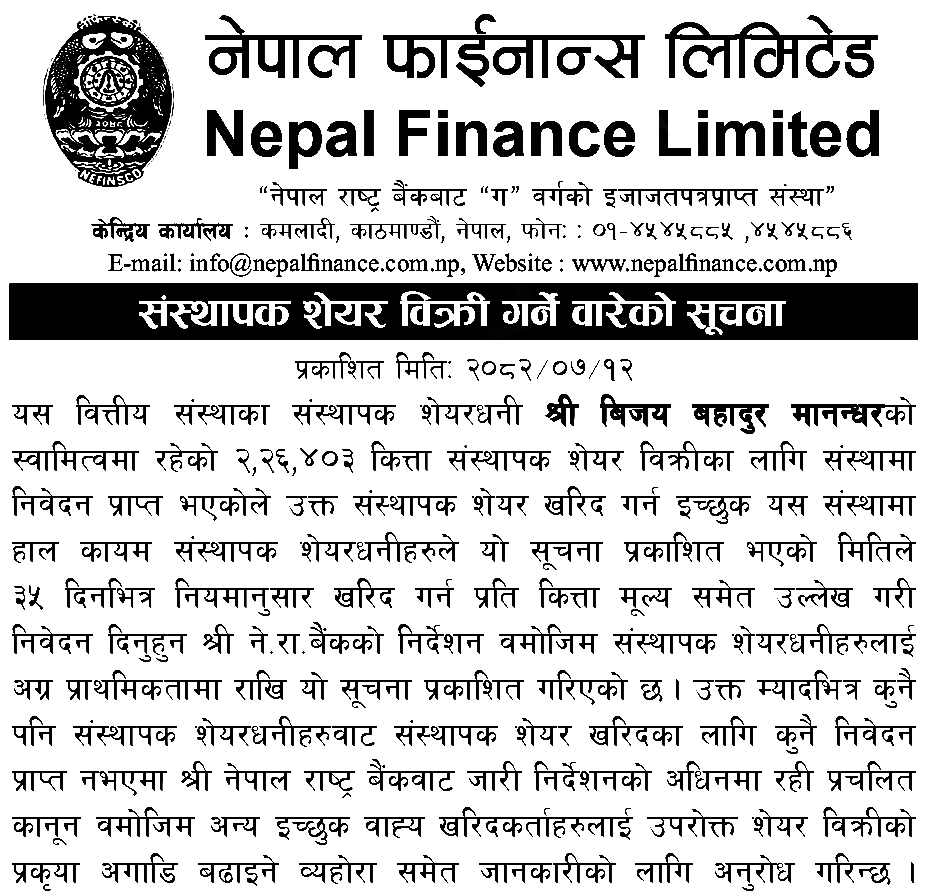 काठमाडौं । नेपाल फाइनान्स लिमिटेडले संस्थापक शेयरधनी बिजय बहादुर मानन्धरको स्वामित्वमा रहेको २ लाख २६ हजार ४०३ कित्ता संस्थापक शेयर बिक्रीमा राखेको छ।