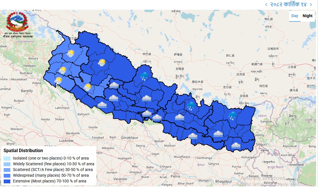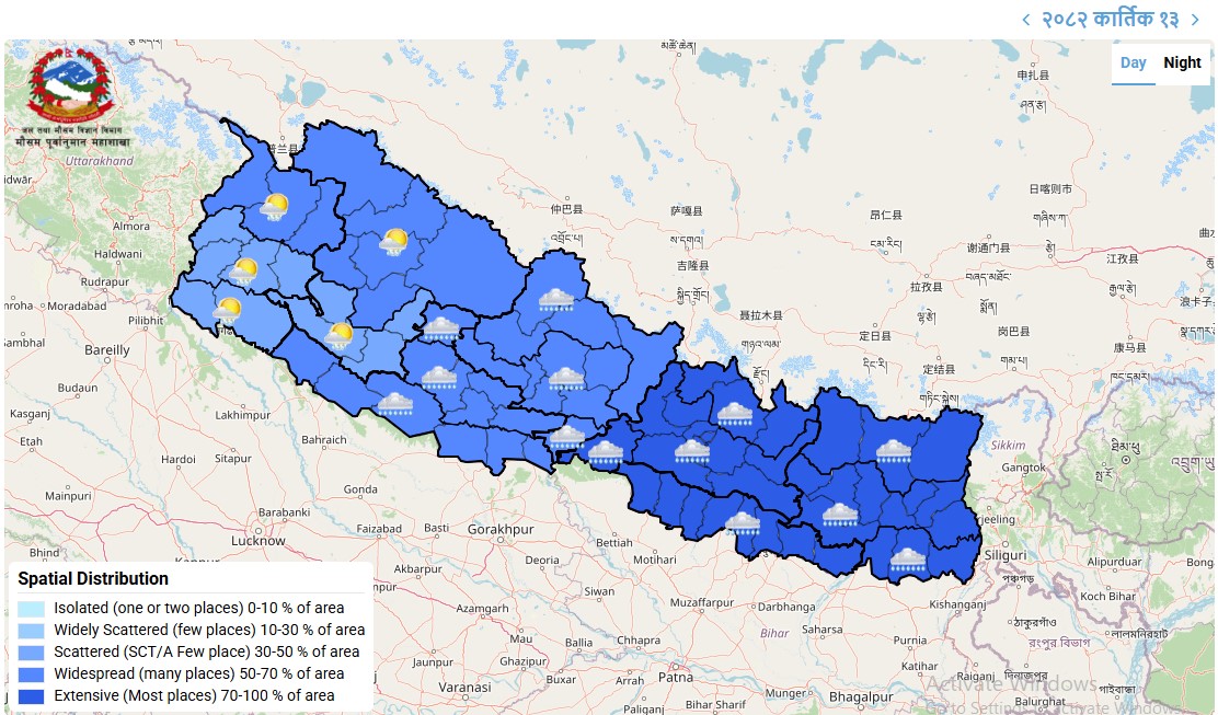 विभागका अनुसार आज कोशी, मधेश, बागमती, गण्डकी र लुम्बिनी प्रदेश लगायतका बाँकी पहाडी भू–भागमा अधिकांश बदली रही तराई भू–भागमा साधारणतया बदली रहेने छ । बिहीबार कोशी, मधेश, बागमती प्रदेशका धेरै स्थानहरुमा तथा गण्डकी र लुम्बिनी प्रदेशका अधिकांश स्थानमा मध्यम वर्षा भइरहेको छ ।