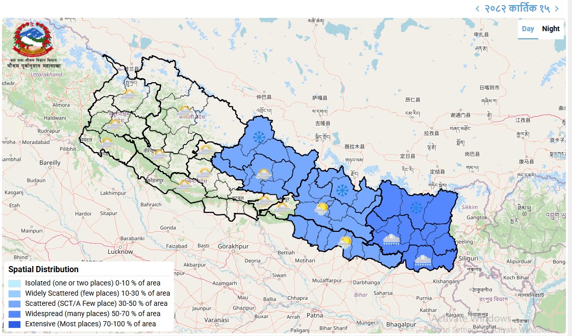 बिहीबार सुदूरपश्चिम र कर्णाली प्रदेशमा केही स्थानहरुमा हल्का हिमपात हुने सम्भावना रहेको विभागले जनाएको छ । आज राति कोशी, मधेश, बागमती, गण्डकी र लुम्बिनी प्रदेश लगायतका बाँकी पहाडी–भूभागमा पूर्ण बदली रही तराई भू–भागमा अधिकांश बदली रहने छ । आज राति देशका उच्च पहाडी क्षेत्रमा हिमपातको सम्भवना रहेको छ ।