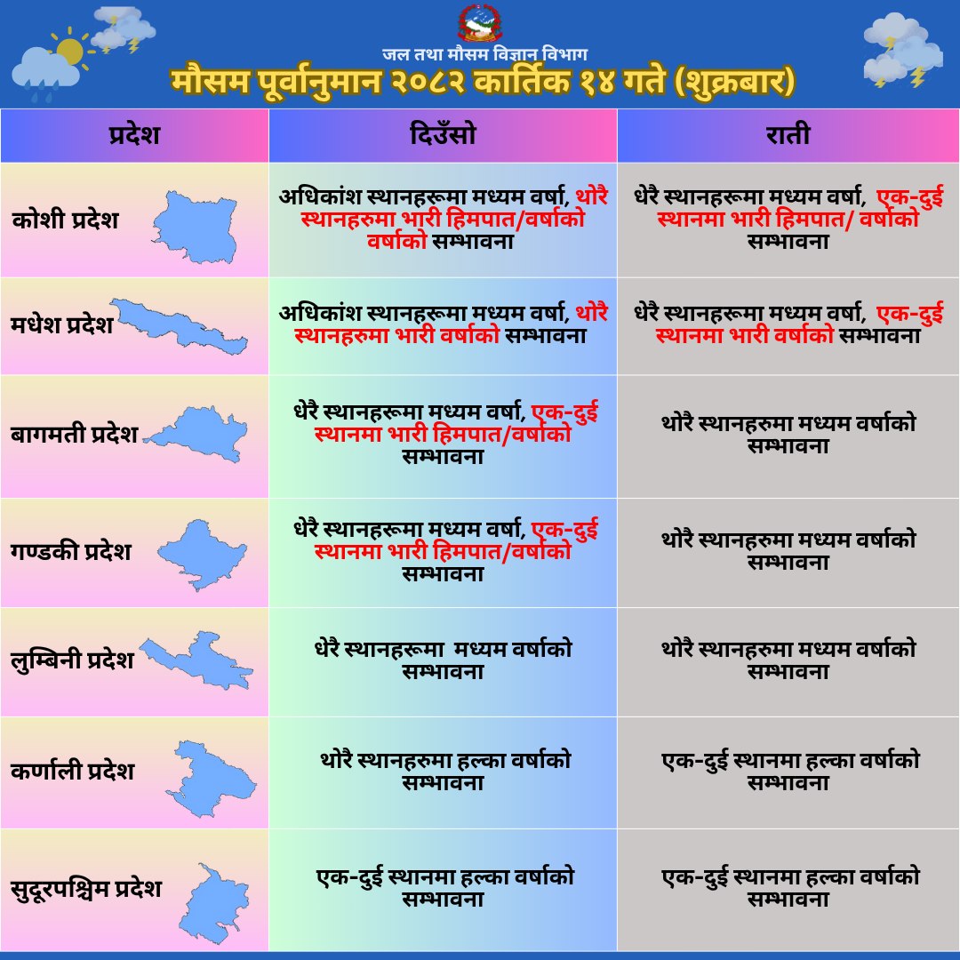 त्यस्तै आज राति कोशी प्रदेशमा भारी वर्षा र हिमपातको र बागमती प्रदेशमा एक–दुई स्थानमा भारी वर्षाको सम्भावना रहेको जनाएको छ। बाँकी प्रदेशहरूमा भने केही स्थानमा हल्का वर्षाको पूर्वानुमान गरेको छ।