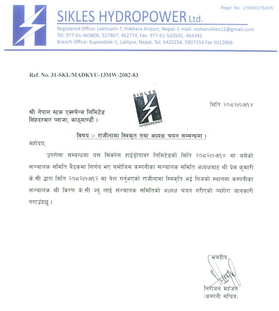 कम्पनी सञ्चालक समितिको कात्तिक १४ गते बसेको समितिको बैठकको निर्णयले तत्कालिन अध्यक्षको राजिनामा स्वीकृतका साथै नयाँ अध्यक्ष नियुक्त गरेको कम्पनी सचिव निराजन महर्जनले बताए ।
