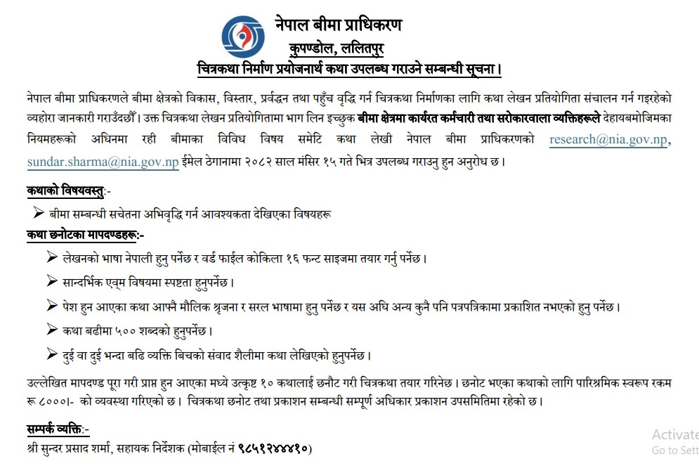 बीमा क्षेत्रको विकास, विस्तार, प्रवद्र्धन तथा पहुँच बृद्धि गर्न चित्रकथा निर्माणका लागि कथा लेखन प्रतियोगिता सञ्चालन गरिएको बीमा प्राधिकरणले जनाएको छ । प्रतिस्पर्धीहरुले कथा तयार गरी तोकीएको इमेल मार्फत पठाउन सक्नेछन् ।