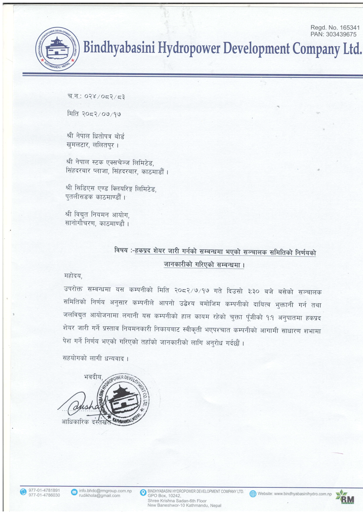 कम्पनीले आफ्नो उद्देश्य बमोजिम कम्पनीको दायित्व भुक्तानी गर्न तथा जलविद्युत आयोजनामा लगानी गर्न कम्पनीको हाल कायम चुक्ता पूँजीको १ बराबर १ को अनुपातमा हकप्रद शेयर जारी गर्ने निर्णय गरेको हो।