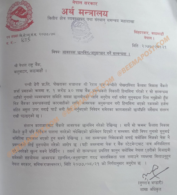 प्राप्त तथ्य र प्रमाणहरूमा सो घटनामा बैंकिङ कसूर भएको भन्दै अर्थ मन्त्रालयले छानबिन गरी दोषीमाथि कारवाही गर्न २०७७ साल मंसिर २१ गते च.नं ४०९ नम्वरको पत्रमार्फत निर्देशन दिंदा समेत नेपाल राष्ट्र बैंकका तत्कालीन गभर्नर महाप्रसाद अधिकारीको संलग्नतामा सेटिङ गरेर छानबिन नै नगरेको पत्ता लागेको छ ।