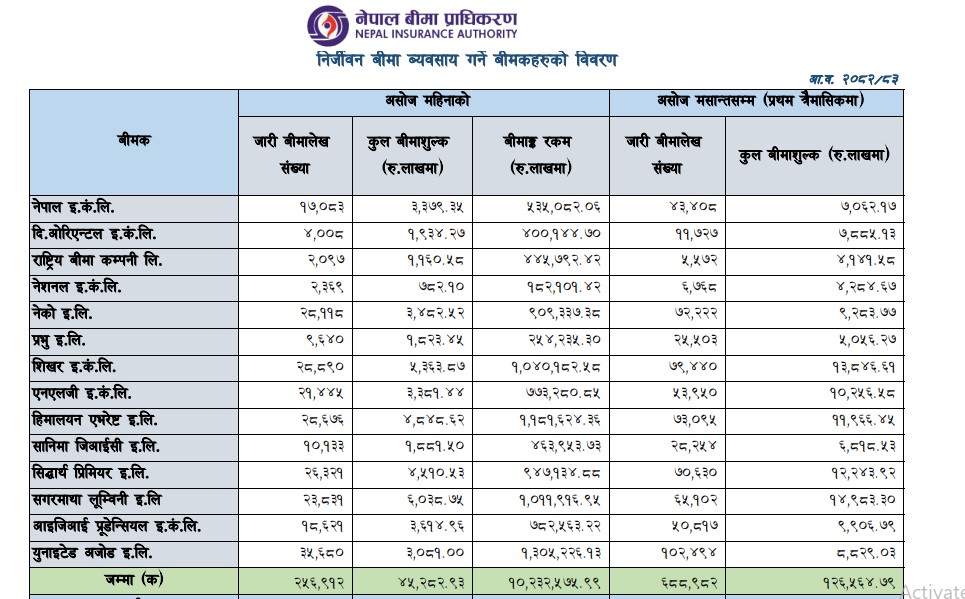 नेपाल बीमा प्राधिकरणले मंगलबार सार्वजनिक गरेको वित्तीय विवरण अनुसार हाल नेपालमा सञ्चालित १४ निर्जीवन बीमा कम्पनीहरुले तीन महिनाको अवधिमा उक्त बीमा शुल्क आर्जन गरेका हुन् ।