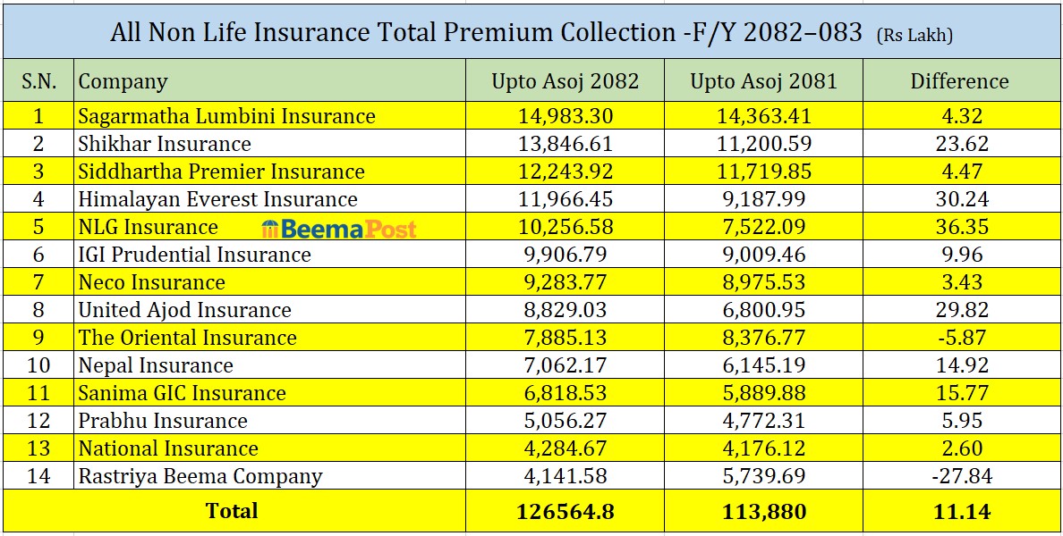 चालु आर्थिक वर्षको असोज मसान्तसम्मको अवधिमा निर्जीवन बीमा कम्पनीहरुमध्ये सगरमाथा लुम्बिनी इन्स्योरेन्सले सबैभन्दा बढी बीमा शुल्क आर्जन गरेको छ । साथै गत आर्थिक वर्षको तुलनामा एनएलजी इन्स्योरेन्स र हिमालयन एभरेष्ट इन्स्योेरेन्सको व्यवसाय सर्वाधिक अंकले बृद्धि भएको छ । सरकारी स्वामित्वको राष्ट्रिय बीमा कम्पनी र द ओरियण्टल इन्स्योरेन्सको व्यवसाय घटेको छ ।