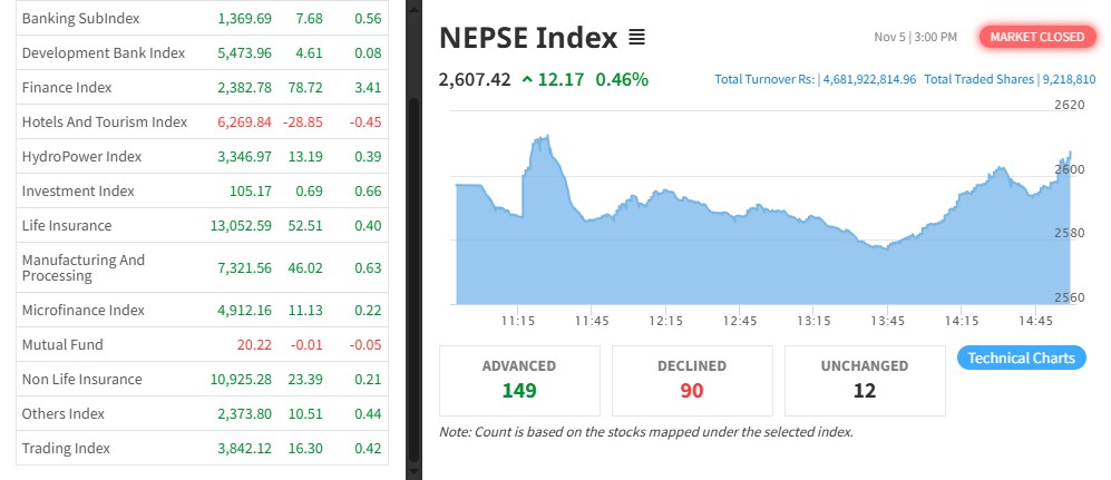 नेपाल स्टक एक्सचेञ्ज (नेप्से) १२.१७ अकंले बढेर २६०७.४२ बिन्दुमा कायम भएको छ । आज३१२ कम्पनीको ९२ लाख १८ हजार कित्ता शेयर किनबेच हुँदा ४ अर्ब ६८ करोड १९ लाख रुपैयाँको कारोबार भएको हो ।