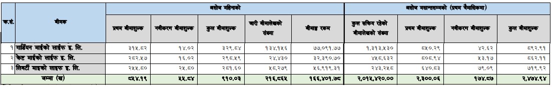 काठमाडौं । लघु जीवन बीमा कम्पनीहरूले चालू आर्थिक वर्ष २०८२।०८३ को पहिलो त्रैमाससम्म २४ करोड ७४ लाख रुपैयाँ कुल बीमाशुल्क संकलन गरेका छन् ।