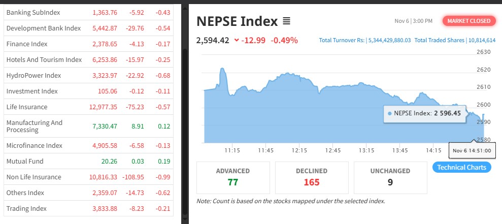 नेपाल स्टक एक्सचेञ्ज (नेप्से) १२.९९ अकंले घटेर २५९४.४२ बिन्दुमा कायम भएको छ । आज ३२० कम्पनीको १ करोड ८ लाख १४ हजार कित्ता शेयर किनबेच हुँदा ५ अर्ब ३४ करोड ४४ लाख रुपैयाँको शेयर कारोबार भएको हो ।