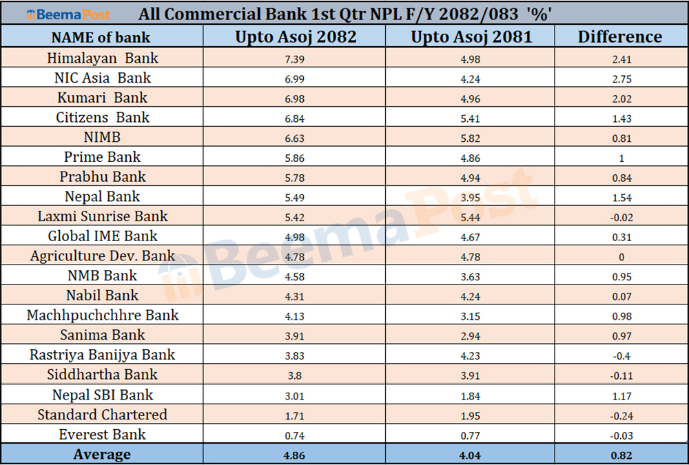 चालु आर्थिक वर्ष २०८२।०८३ को पहिलो त्रैमास (साउनदेखि असोज) सम्मको तथ्याङ्गले यस्तो देखाएको हो । गत आर्थिक वर्ष २०८१।०८२ को पहिलो त्रैमासमा औसतमा ४.०४ प्रतिशत रहेको खराब कर्जा चालु आर्थिक वर्षको पहिलो त्रैमाससम्ममा ४.८६ प्रतिशत पुगेको छ ।