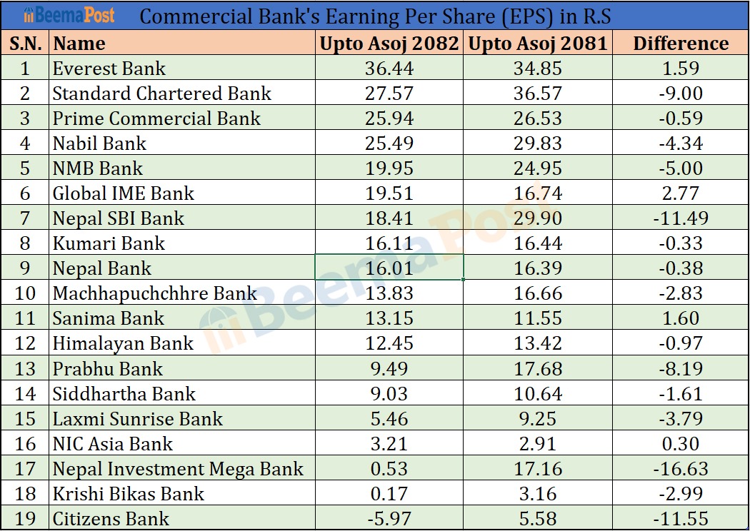 नेपाल स्टक एक्सचेन्ज (नेप्से)मा सूचीकृत भएका १९ वाणिज्य बैंकहरुमध्ये पहिलो त्रैमासमा चार वाणिज्य बैंकबाहेक सबैको ईपीएस घट्न पुगेको छ । अझ सिटिजन्स बैंकको ईपीएस ऋणात्मक अवस्थामा रहेको छ ।