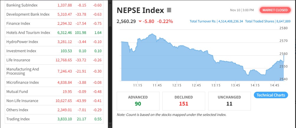 नेपाल स्टक एक्सचेञ्ज (नेप्से) ५.८० अकंले घटेर २५६०.२९ बिन्दुमा कायम भएको छ । आज ३२७ कम्पनीको ८६ लाख ४७ हजार कित्ता शेयर किनबेच हुँदा ४ अर्ब ५१ करोड ४४ लाख रुपैयाँको शेयर कारोबार भएको हो ।