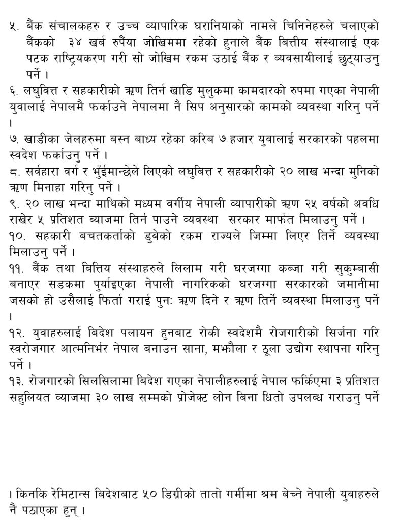 सहकारी तथा लघुवित्त सम्बन्धी मागमा, सर्वसाधारणले लिएको २० लाख रुपैयाँसम्मको ऋण मिनाहा गर्ने र २० लाखभन्दा बढी ऋण २५ किस्तामा पाँच प्रतिशत ब्याजदरमा तिर्न सक्ने व्यवस्था गर्नुपर्ने कुरा उल्लेख छ।