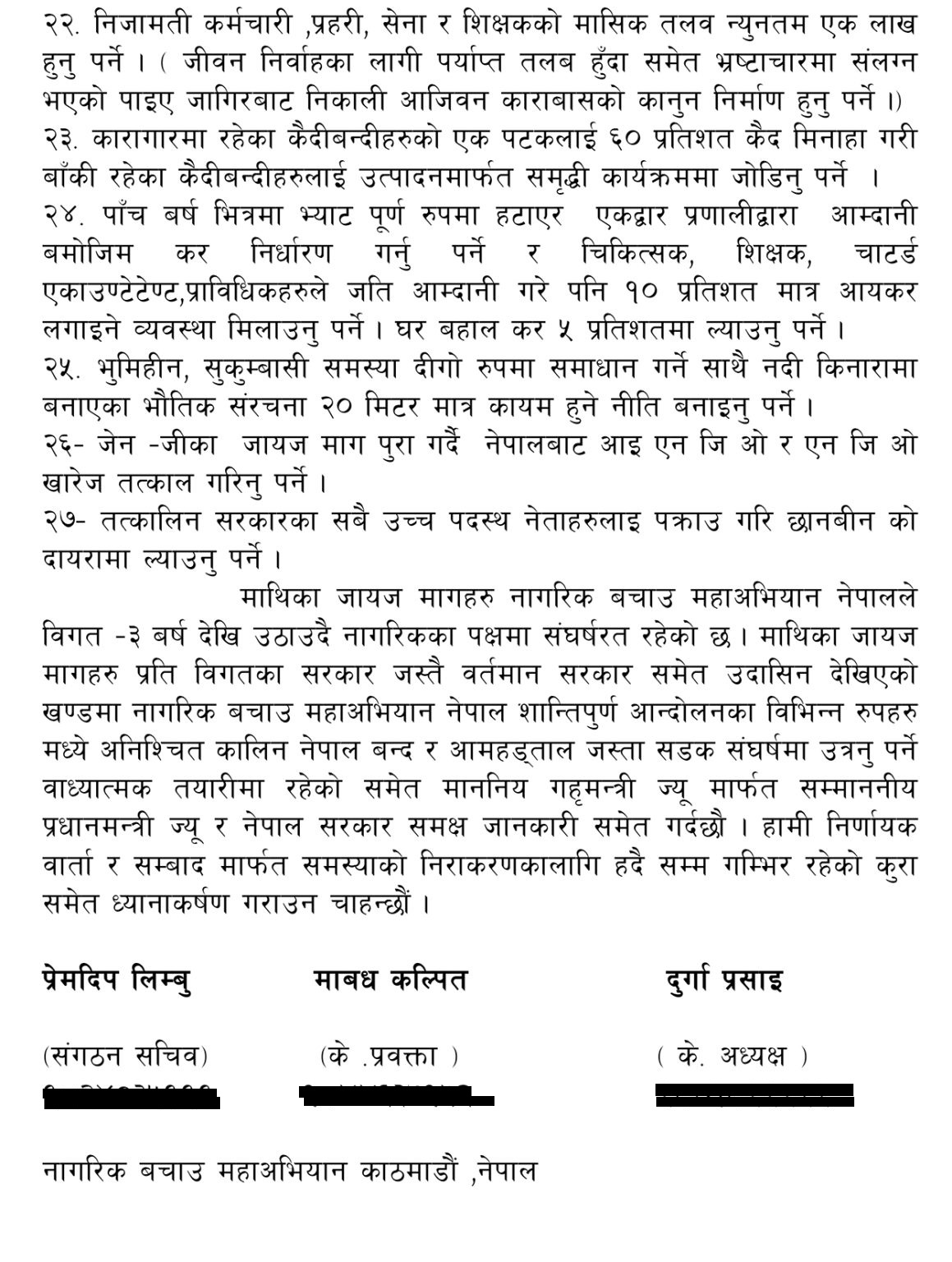 प्रसाईं समूहले तयार पारेको २७ बुँदे मागपत्रले शासन व्यवस्था, धार्मिक स्वतन्त्रता, आर्थिक सुधार र नागरिक अधिकारलाई केन्द्रविन्दु बनाएको छ।