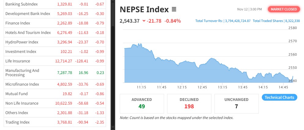 यसदिन १२ उपसूचकमा राताम्य लागेको छ । आज वाणिज्य बैंक समूहको ०.६७ प्रतिशत, विकास बैंक समूहको ०.३० प्रतिशत, फाइनान्स समूहको ०.७९ प्रतिशत, होटल तथा पयर्टन समूहको ०ं.१८ प्रतिशतले शेयर मूल्य घटेको हो ।