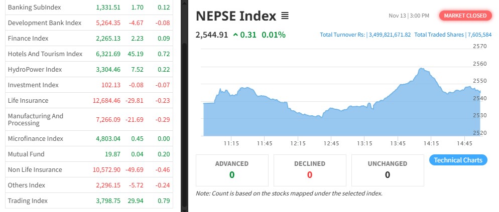 नेपाल स्टक एक्सचेञ्ज (नेप्से) ०.३१ अकंले बढेर २५४४.९१ बिन्दुमा कायम भएको छ । आज३२९ कम्पनीको ७६ लाख ५ हजार कित्ता शेयर किनबेच हुँदा ३ अर्ब ४९ करोड ९८ लाख रुपैयाँको शेयर कारोबार भएको हो ।