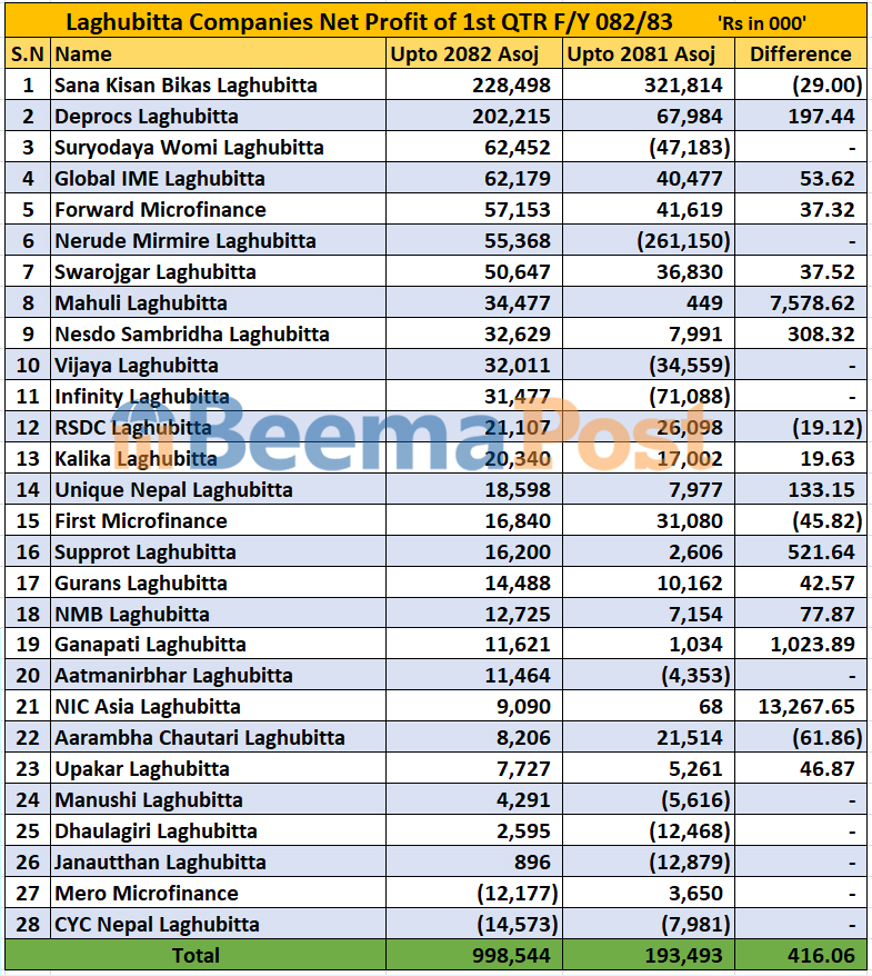 लघुवित्तहरुको खुद नाफा ४१६%ले बढ्यो, करिव १ अर्ब खुद नाफामा कसले कति कमाए ? (सूचीसहित)