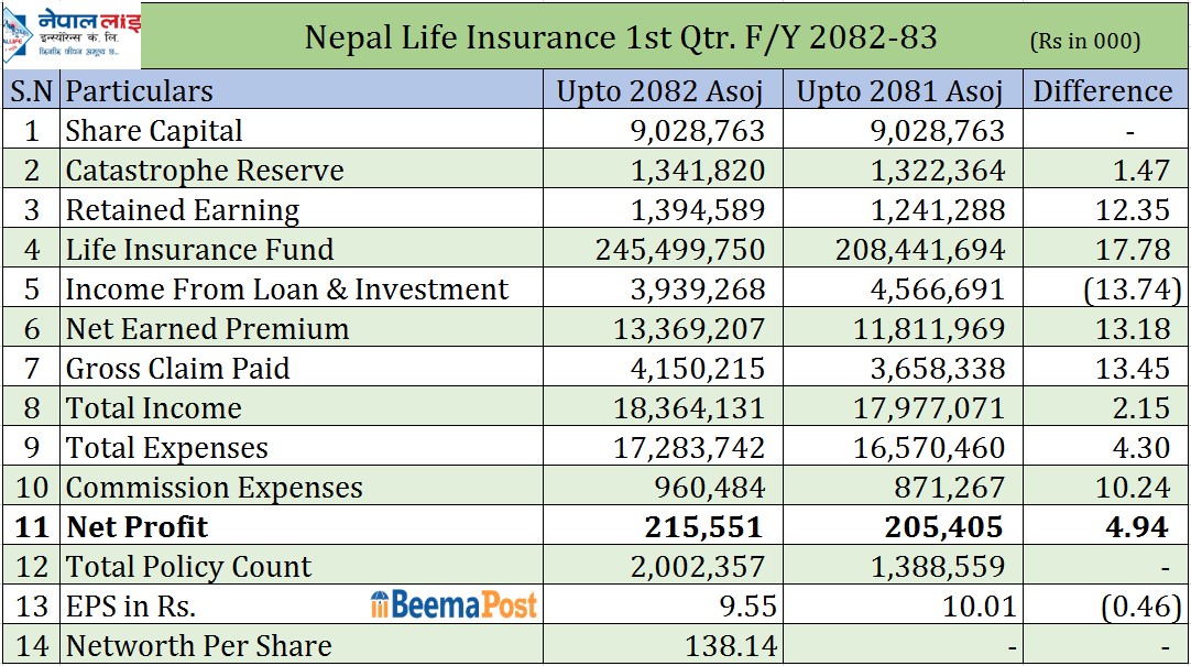 त्यसैगरी कम्पनीको खुद बीमाशुल्क आर्जन ११ अर्ब ८१ करोड १९ लाख रुपैयाँबाट १३.१८ प्रतिशतले बढेर १३ अर्ब ३६ करोड ९२ लाख रुपैयाँ पुगेको छ। यता कुल आम्दानी १७ अर्ब ९७ करोड ७० लाख रुपैयाँबाट बढेर १८ अर्ब ३६ करोड ४१ लाख रुपैयाँ पुग्दा कम्पनीको कुल खर्च पनि १६ अर्ब ५७ करोड ४ लाख रुपैयाँबाट बढेर १७ अर्ब २८ करोड ३७ लाख रुपैयाँ नाघेको छ।