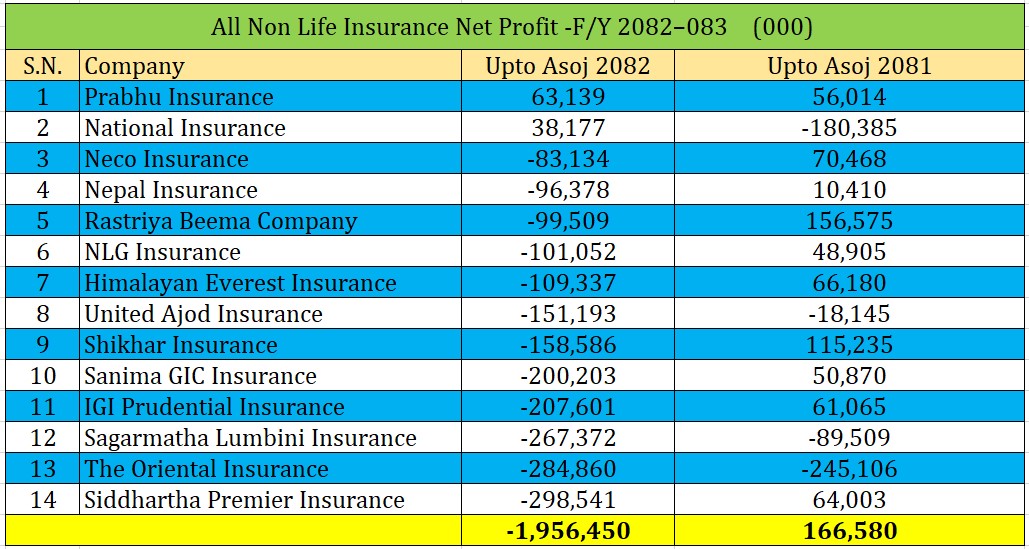 चालु आर्थिक वर्षको असोज मसान्तसम्मको अवधिमा सिद्धार्थ प्रिमियर इन्स्योरेन्सको २९ करोड ८५ लाख रुपैयाँ, द ओरियण्टल इन्स्योरेन्सको २८ करोड ४८ लाख रुपैयाँ, सगरमाथा लुम्बिनी इन्स्योरेन्सको २६ करोड ७३ लाख रुपैयाँ, आइजिआई प्रुडेन्सियल इन्स्योरेन्सको २० करोड ७६ लाख रुपैयाँ खुद नाफा ऋणात्मक रहेको छ ।