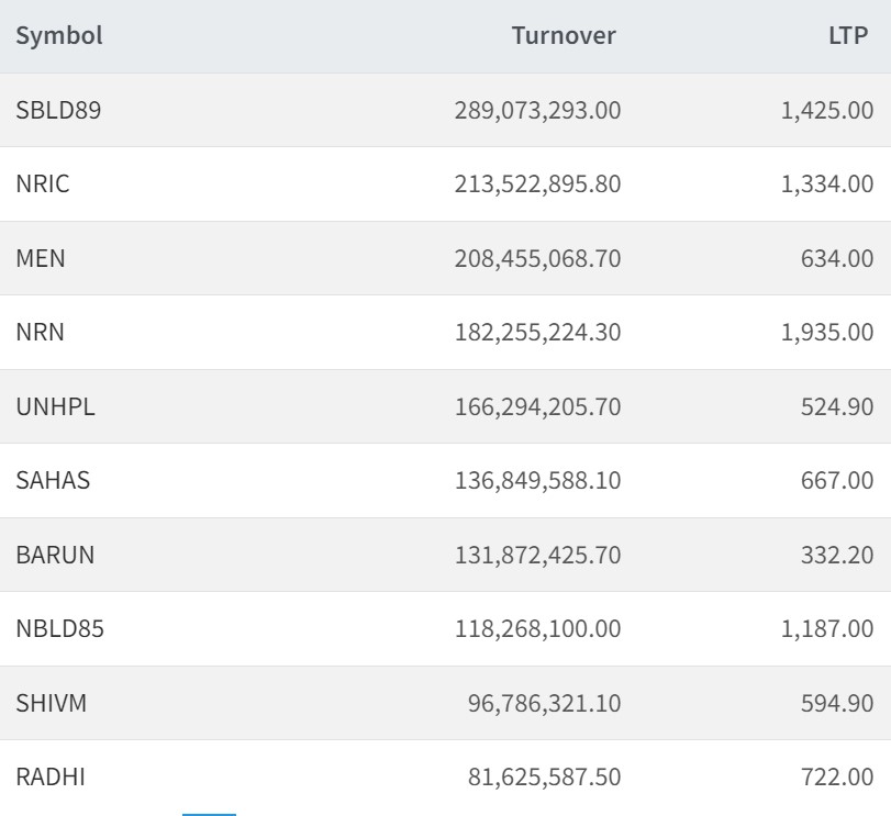 त्यसैगरी एनआरएनको १८ करोड २२ लाख, युनियन हाइड्रोपावरको १६ करोड ६२ लाख, साहस ऊर्जाको १३ करोड ६८ लाख, बरुण हाइड्रोपावरको १३ करोड १८ लाख, नबिल डिबेन्चर २०८५ को ११ करोड ८२ लाख, शिवम् सिमेन्टको ९ करोड ६७ लाख र राधी विद्युतको ८ करोड १६ लाख रुपैयाँमाथिको शेयर कारोबार भएको छ।
