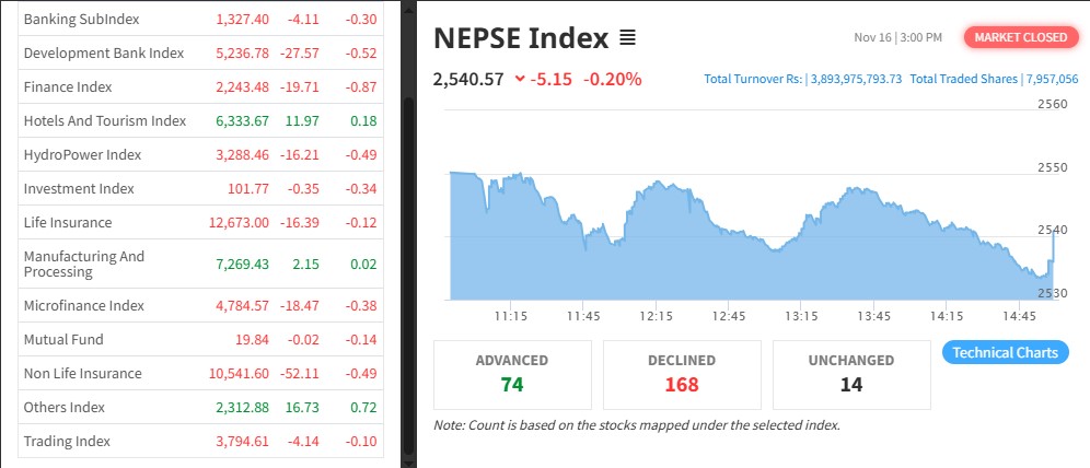 नेपाल स्टक एक्सचेञ्ज (नेप्से) ५.१५ अकंले घटेर २५४०.५७ बिन्दुमा कायम भएको छ। आज ३३७ कम्पनीको ७९ लाख ५७ हजार कित्ता शेयर किनबेच हुँदा ३ अर्ब ८९ करोड ३९ लाख रुपैयाँको शेयर कारोबार भएको हो ।