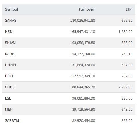 त्यस्तै, राद्यी जलविधुतको, युनियन हाईड्रोपावर, वुटवल पावर, सिईडिबी होल्डिङ्ग, लक्ष्मी सनराइज बैंक, माउन्टेन इनर्जी र सर्वोत्तम सिमेन्टसको सर्वाधिक कारोबार भएको छ।