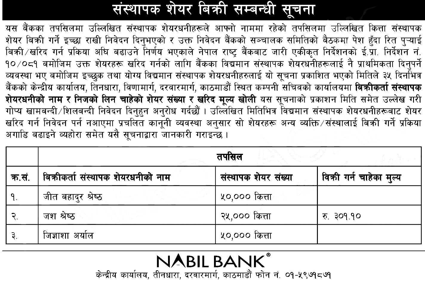 काठमाडौं । नबिल बैंक लिमिटेडले आफ्ना ३ जना संस्थापक शेयरधनीहरूको स्वामित्वमा रहेको कुल १ लाख २५ हजार कित्ता संस्थापक शेयर बिक्रीमा राखेको छ।