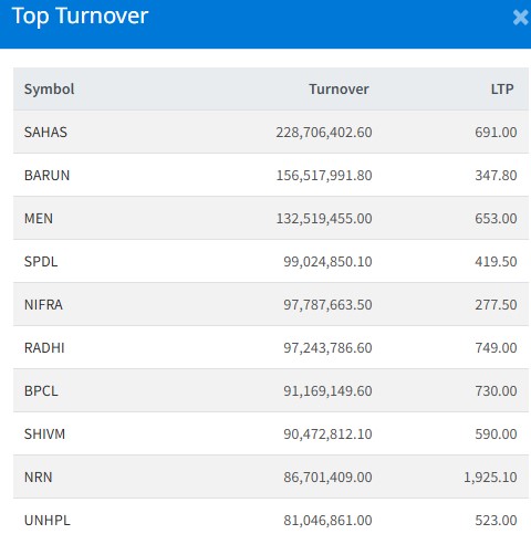 त्यस्तै, वरुण हाईड्रोपावर, माउन्टेन इनर्जी, सिनर्जी पावर, निफ्रा, राद्यी विधुत, वुटवल पावर, शिवम सिमेन्टस, एनआएन इन्फ्रास्टक्चर र युनियन हाईड्रोपावरको सर्वाधिक कारोबार भएको छ।