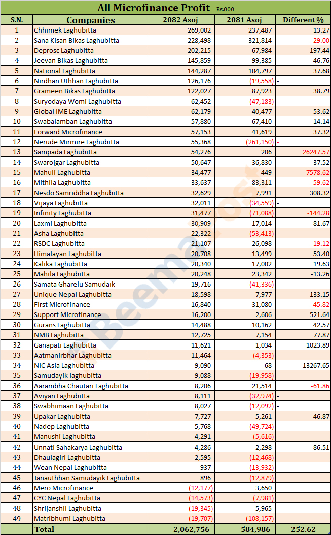 त्यस्तै, डिप्रोक्स लघुवित्तको नाफा १९७ प्रतिशतले बढेर २० करोड २२ लाख, जीवन विकास लघुवित्तको ४६ प्रतिशतले बढेर १४ करोड ५८ लाख र नेशनल लघुवित्तको ३७ प्रतिशतले बढेर १४ करोड ४२ लाख रुपैयाँ रहेको छ ।